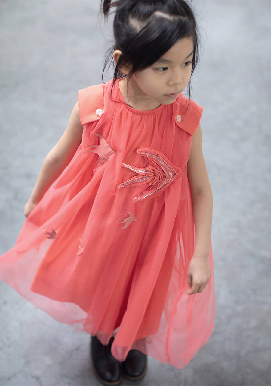 The lightness of a tulle dress that flies free in the sky like a swallow. A sustainable and responsible collection to protect the little ones' dreams.