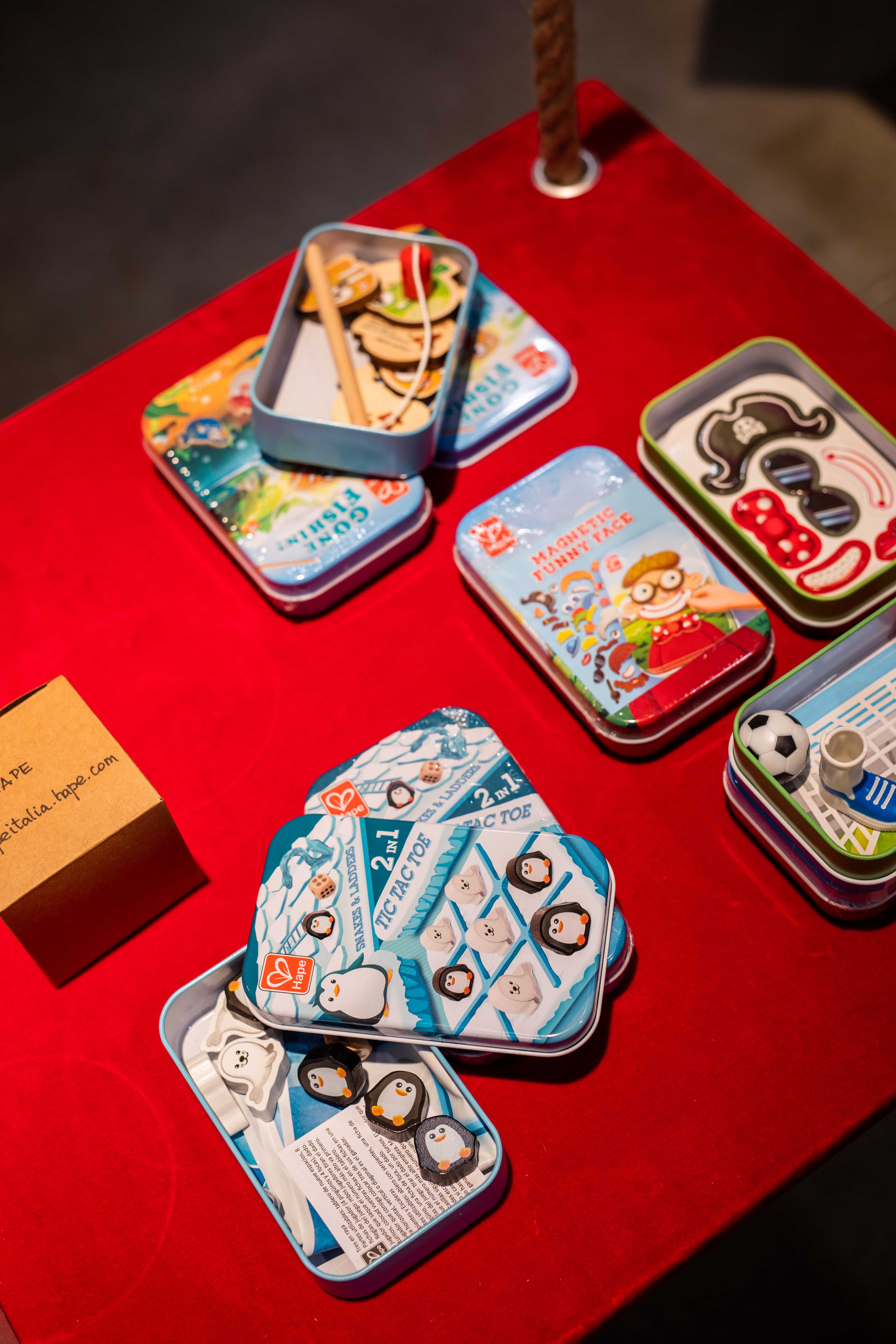 Scatole dalla bella grafica, dal packaging interessante studiati per giochi da portare con sé ovunque. Giochi classici e inediti, nati per i bambini o per gli adulti, ma da condividere. Riempiono il tempo, divertono, migliorano, catalizzano le sfide fra amici o la competizione con se stessi. Diventano riti del quotidiano o segni di un’occasione speciale. In ogni caso fanno compagnia!